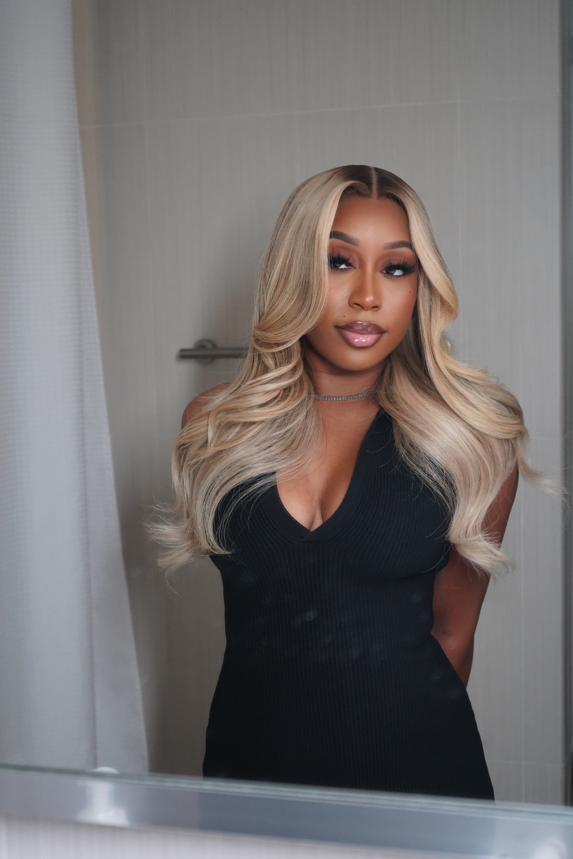 This luxury unit is a full-on soft life fantasy designed for the woman who owns every room without even trying. It features voluminous layers, soft body waves, and a deep, flawless middle part that frames the face like a dream. The custom buttery blonde blend is enriched with soft lowlights and natural shadow roots, creating a high-end, dimensional finish. This unit doesn’t just look expensive — it feels expensive. Crafted with completely raw human hair, it moves with grace and bounce, giving you that effortlessly glamorous look every time you wear it.